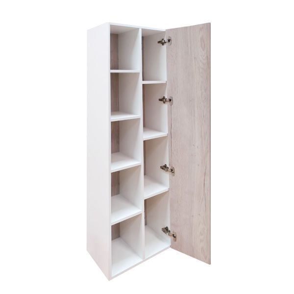 Название: Шкаф-колонна Артикул: Бремен 45 Варианты цвета: Дуб белый Материал: влагостойкое ЛДСП Габариты ШхВхГ: 350*1600*320 мм Подвесная шкаф-колонна с двумя распашными дверцами. Створки оборудована петлями с системой плавного закрывания. За верхней створкой 2 горизонтальные полки, за нижней - одна. Дверцы при установке колонны можно подвесить как в левом, так и в правом варианте
