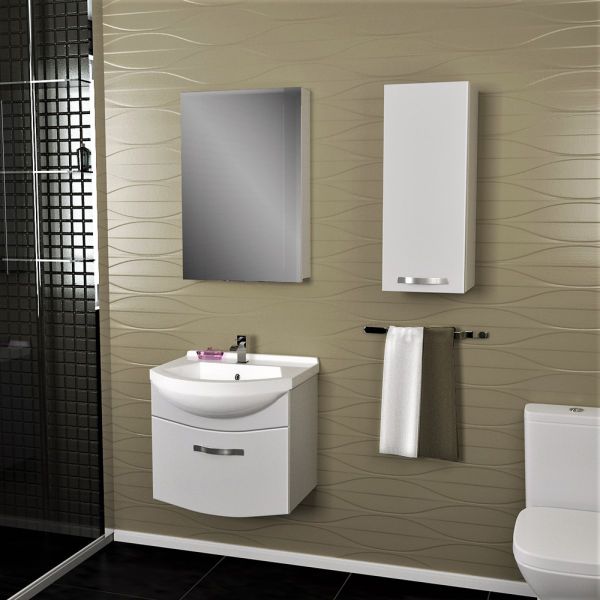 Подвесная коллекция со скругленными линиями фасада в 4-х размерах 55, 65, 75, 90 Лаконичный дизайн, глянцевая поверхность фасада, механизмы Hettich. Небольшая глубина тумбы органично впишется в любую, даже небольшую ванную комнату. Глубокий ящик