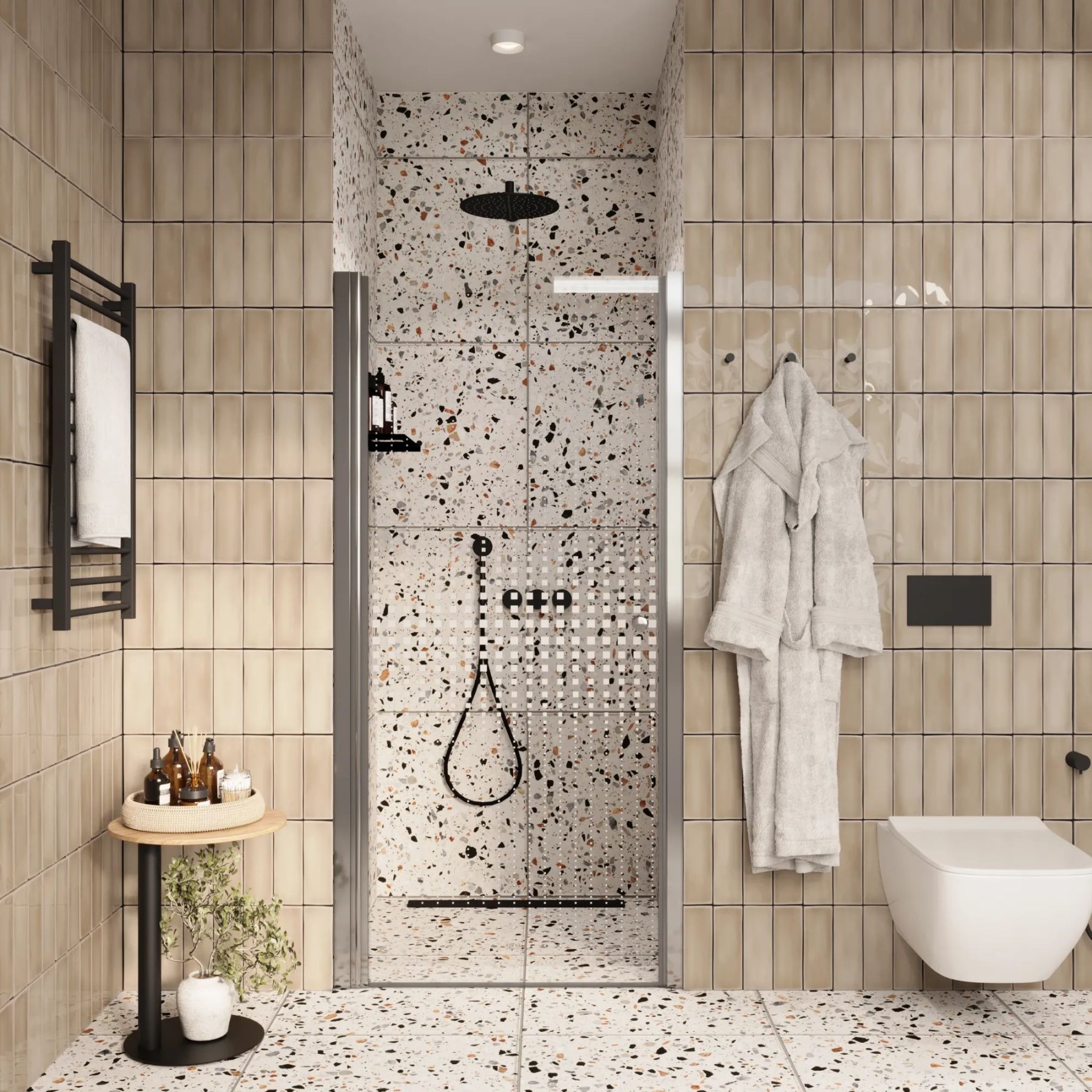 Душевая дверь помогает зонировать помещение на отдельные функциональные участки.