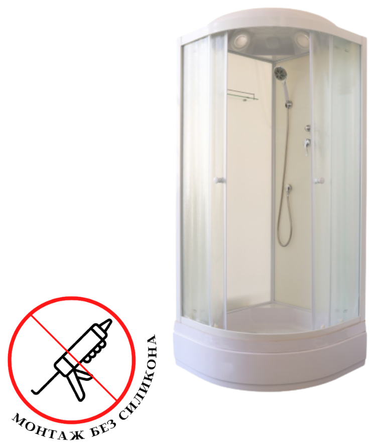 Сборка без применения силикона. Конструкция душевой кабины обеспечивает слив воды внутрь поддона. Сам поддон по всему периметру оснащен водонепроницаемым бортиком высотой 2 см, который исключает перелив воды за пределы душевой зоны.