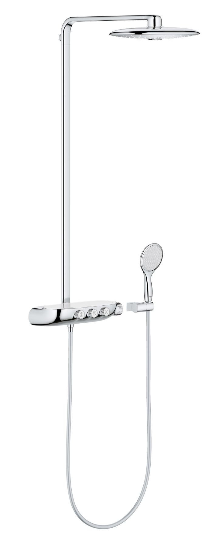 Душевая система Grohe Rainshower System SmartControl Duo 26250000 хромGROHE представляет собой уникальную систему GROHE Rainshower®, оснащенную инновационной технологией кнопочного управления SmartControl. Управление всеми функциями душа еще никогда не было настолько просто. Всего лишь одну кнопку можно включить душ и управлять напором душевых струй. Включение душа происходит по нажатию кнопки с интуитивно понятным символом, а сила напора воды регулируется вращением рукоятки, которой легко управлять даже мокрыми руками.SafeStop, которая ограничивает максимальную температуру - не более 38 градусов Цельсия - наиболее комфортный температурный диапазон для принятия душа. Такая технология исключает случайные температурные перепады, и может быть отключена в случае необходимости. Технология GROHE TurboStat® позволяет обеспечить стабильность температуры даже при резких изменениях давления в водопроводной сети. Кроме того, технология GROHE CoolTouch® предотвращает нагрев внешней поверхности термостата до опасного уровня.В систему GROHE Rainshower® SmartControl входит инновационный мульти-режимный верхний душ и ручная душевая лейка. Верхний металлический душ - важнейший элемент душевой системы, обладает впечатляющими размерами и может похвастаться несколькими разнообразными режимами струи: широкий поток воды, отдых струи, массажный режим и обогащение потока воды пузырьками воздуха.GROHE Rainshower® SmartControl основан на технологиях, разработанных инженерами GROHE в тесном сотрудничестве с LIXIL Technology Group. Эта инновационная душевая система принесет поклонникам продукции GROHE не только массу положительных эмоций, но и дух инноваций и комфорта, присущий всем продуктам компании.