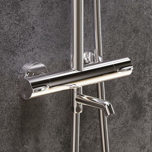 Душевая стойка Damixa Scandinavian Pure 936810000 с термостатом ХромДушевые системы из коллекции Scandinavian Pure – воплощение минималистичного датского дизайна и солидного скандинавского качества. Элегантные обтекаемые формы и ювелирный блеск станут настоящим украшением современной ванной комнаты. Максимальная безопасность: термостатический картридж 35 мм обеспечивает точную настройку температуры и напора воды. Выставляйте комфортные для вас параметры легким поворотом правой ручки смесителя. Увеличенный диаметр верхнего душа с возможностью регулировки угла наклона и ручная лейка в трендовой форме стика подарят вам полный спектр ощущений - помогут взбодриться утром и расслабится вечером. Переключайте потоки воды между ручной и тропической лейками плавным поворотом левой ручки смесителя, а между ручной лейкой и изливом - поворотом излива. Инновационное покрытие High Gloss надежно защищает хромовую поверхность душевой системы от мелких повреждений и сохраняет ювелирный блеск на долгие годы.