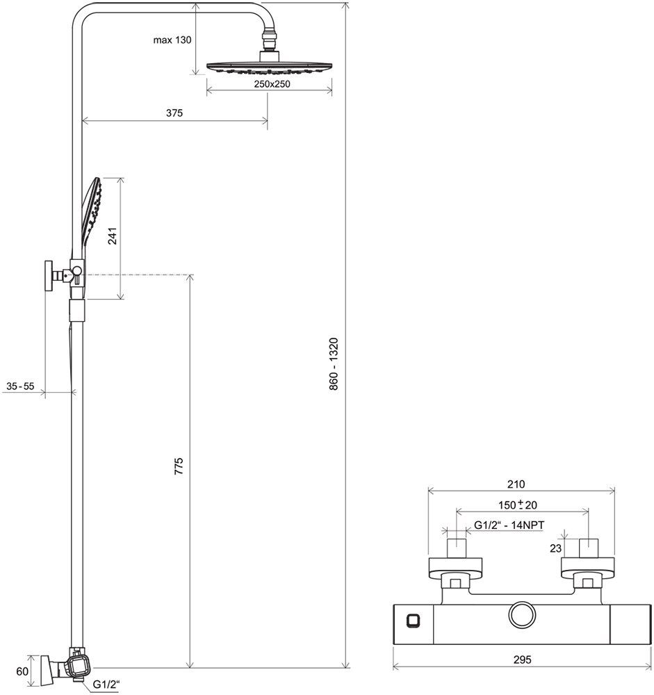 - Высота душевой стойки: регулировка в диапазоне 86-132 см