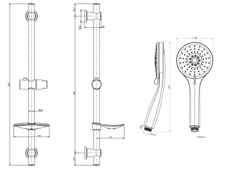 Комплект предназначен для вертикального настенного монтажа и оснащен держателем для лейки, что делает использование удобным и эргономичным. Компактные размеры (высота 68,5 см, ширина 13-15 см, глубина 15 см) и матовое черное покрытие позволяют гарнитуру гармонично вписаться в интерьер современной ванной комнаты, добавляя ему стиля и индивидуальности.