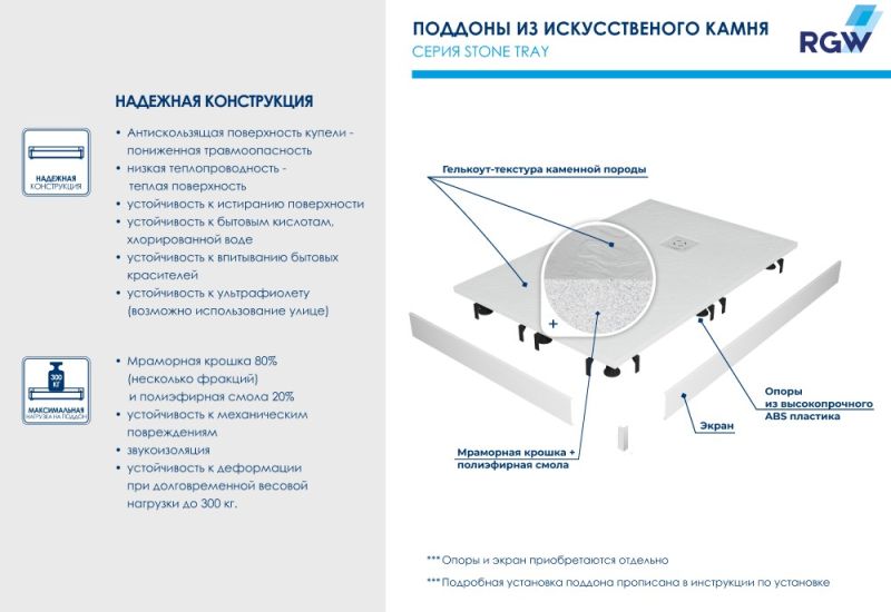 Душевые поддоны RGW ST с фактурой под сланцевый камень.Меняем представление о текстуре «искусственный камень»!В серии душевых поддонов Stone Tray появилась новинка популярной квадратной формы в роскошном белом цвете и трех форматах. При необходимости мы можем выполнить обрезку изделия по индивидуальному размеру.Визуальные акценты и форма поддона - новые, а качество прежнее: рельефная антискользящая поверхность в сочетании с низкой теплопроводностью материала создает ощущение нагретого солнцем камня под вашими ступнями и выводит обычный прием душа на новый уровень комфорта.Высокотехнологичный материал - 80% мраморной крошки плюс полиэфирные смолы - обеспечивает беспрецедентную устойчивость к механическим, химическим и другим видам повреждений, а также выдерживает долговременную весовую нагрузку до 300 кг.Добавьте сюда низкий уровень шума воды, когда вы принимаете душ для ещё большего удовольствия.Новый поддон — это самостоятельный аксессуар вашей душевой. Универсальный цвет, откликающийся на уровень освещения, и текстура “под камень” идеально сочетаются с интерьерами от смелых лофт и хайтек до романтичного прованса, а решетка из нержавеющей стали, защищающая слив, создаст безупречный аккомпанемент душевым системам, а таком же оттенке.Обратите внимание: фактические размеры с учетом заполнения швов могут меняться в пределах -8/+2 мм.По вашему желанию можем установить поддон на ножки: