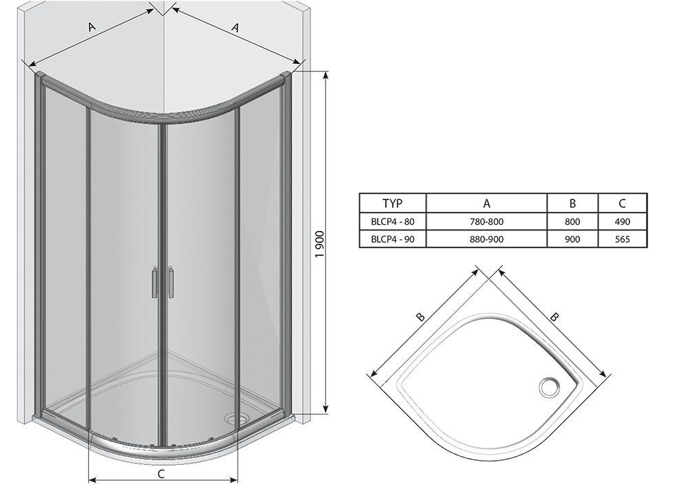 Изделие состоит из двух прямых и двух изогнутых частей, образующих раздвижные двери. Устанавливается в облицованный кафелем угол ванной комнаты на поддоны RAVAK RONDA, ELIPSO, ELIPSO PRO, ELIPSO PRO FLAT, ELIPSO PRO CHROME или непосредственно на пол со встроенным душевым каналом