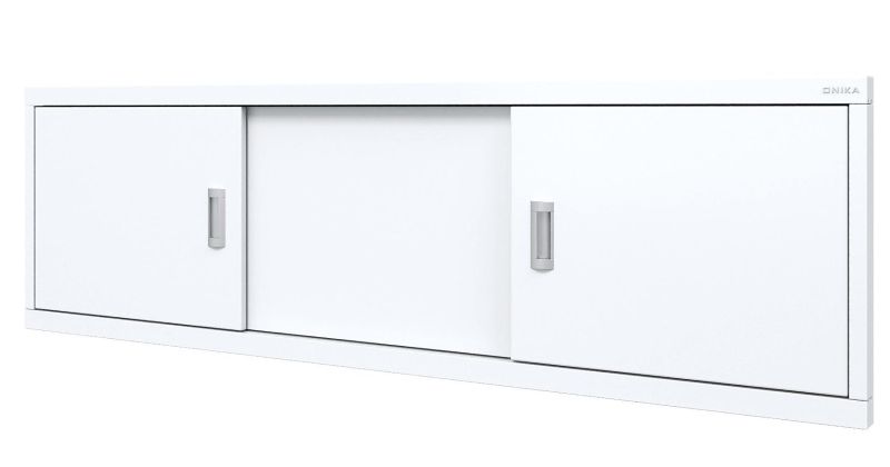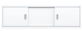 Конструкция имеет три подвижные двери из МДФ, покрытых высокоглянцевой белой пленкой. Две боковые дверцы с врезными хромированными металлическими ручками.