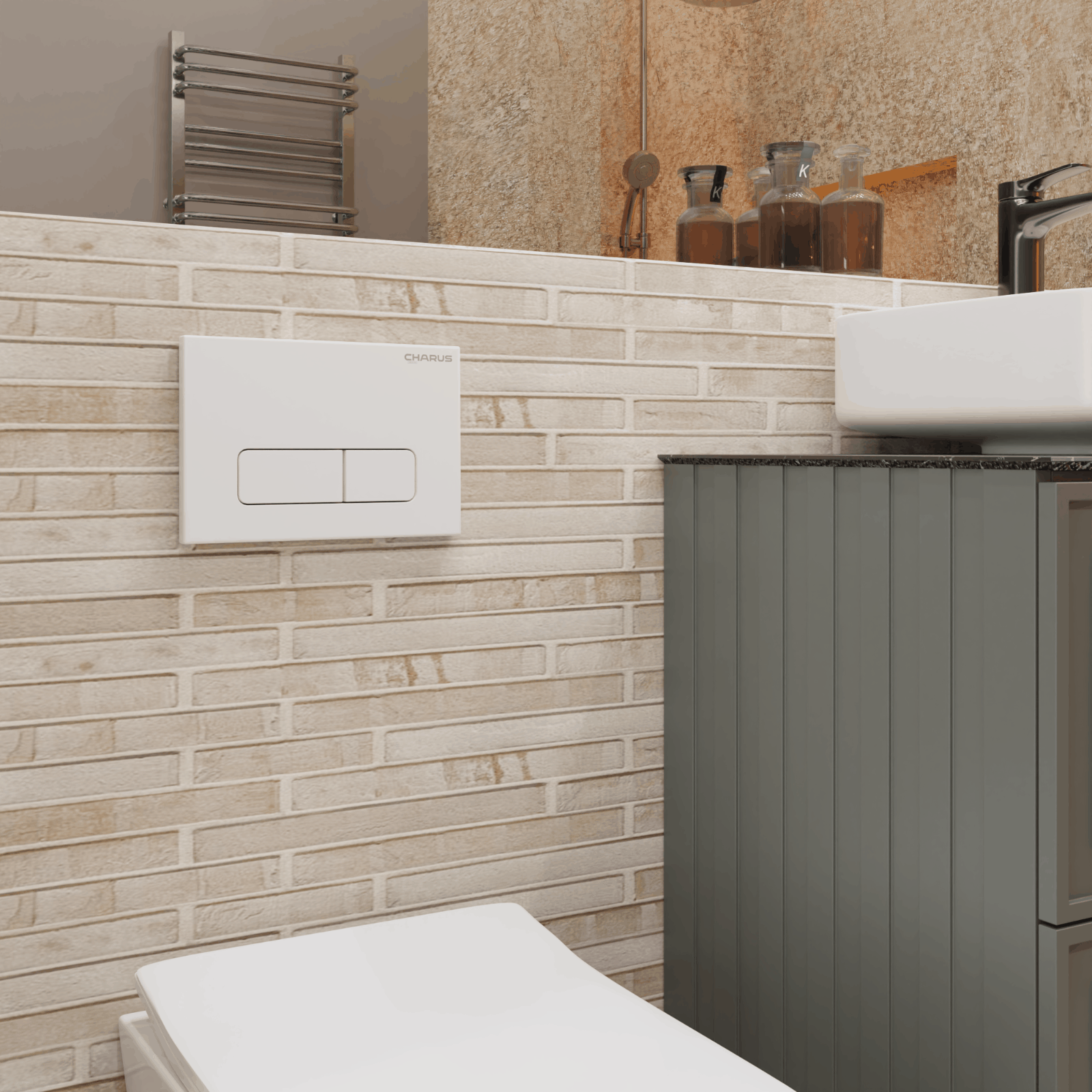 Клавиша для инсталляции CHARUS TMКомплектация: Панель в сборе, 2 крепежных пластиковых винта, 2 толкателя привода смыва, инструкция по установке