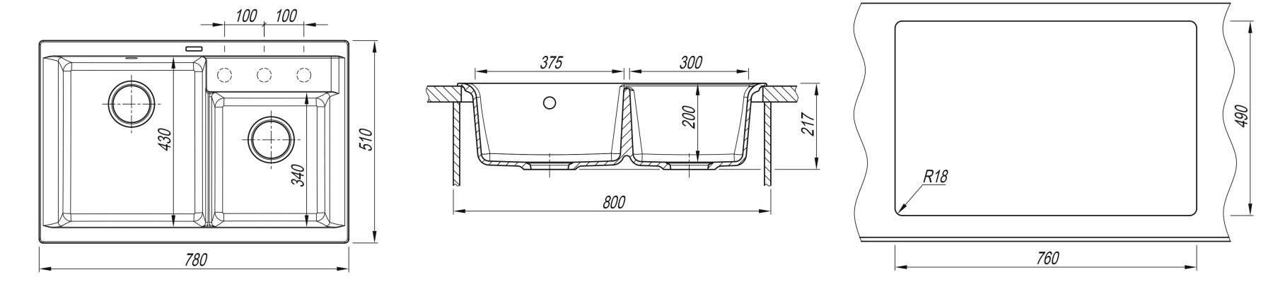 Мойка Касси 780 - основная чаша (37.5 x 43 сантиметра) дополнительная (30 x 34 сантиметра), подойдет для любого кухонного гарнитура.
