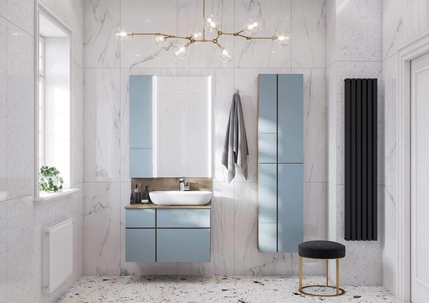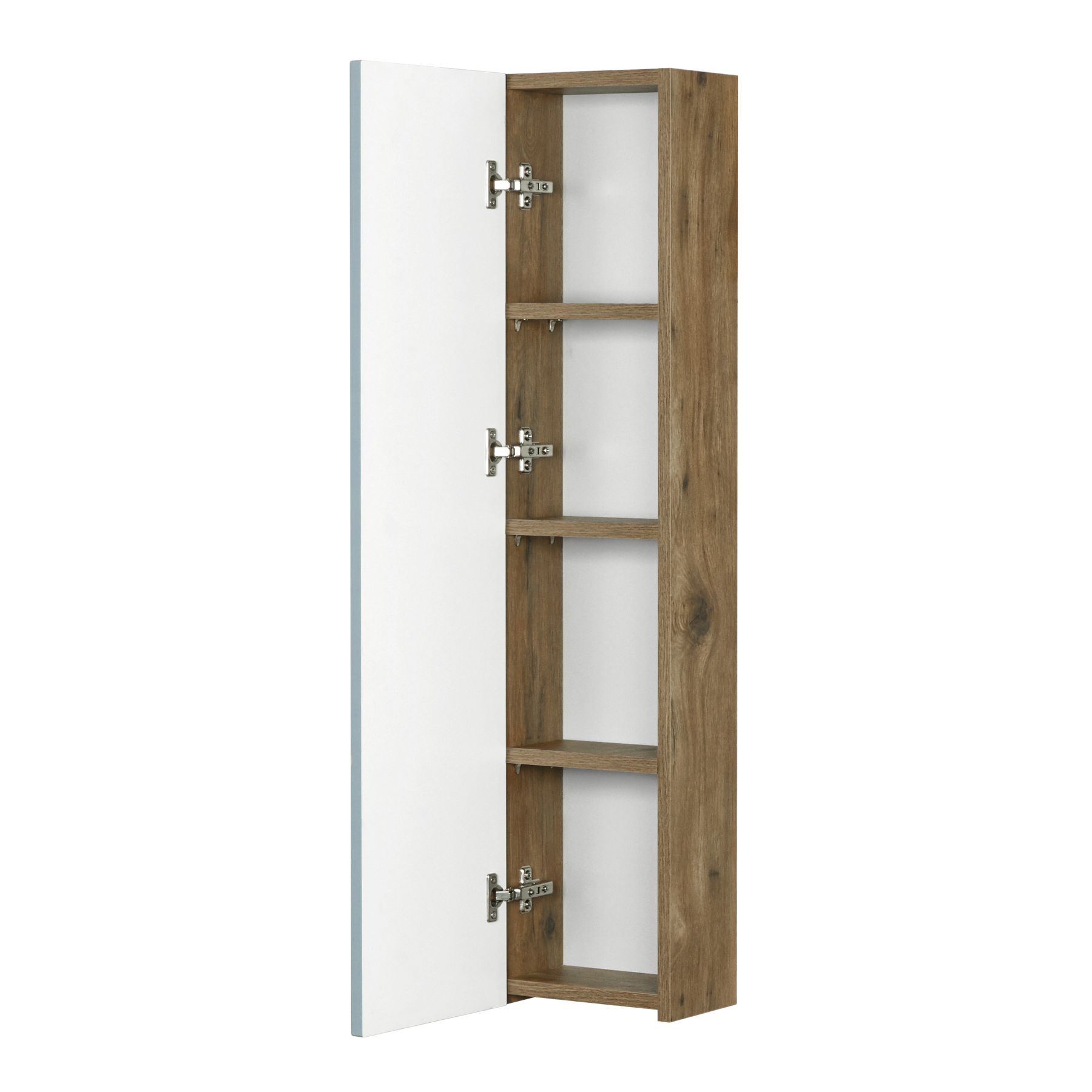 • Открывается модуль за фасад. Внутреннее пространство шкафчика поделено на ассиметричные секции, что позволяет разместить различные косметические средства