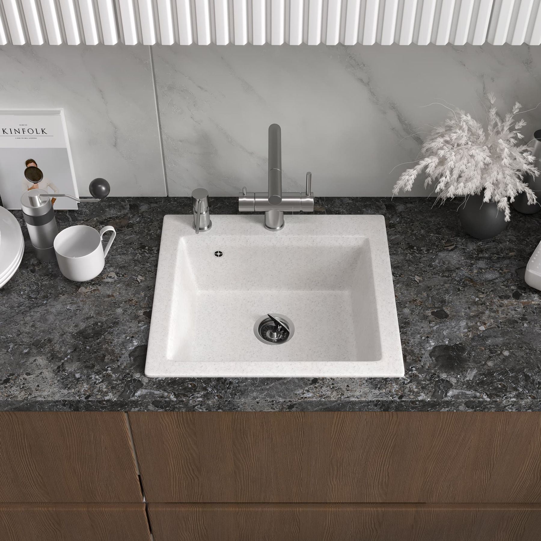 В мойке предусмотрено отверстие для установки смесителя. Используя алмазную коронку, можно сделать дополнительные отверстия для дозатора жидкого мыла или сифона с полуавтоматом.