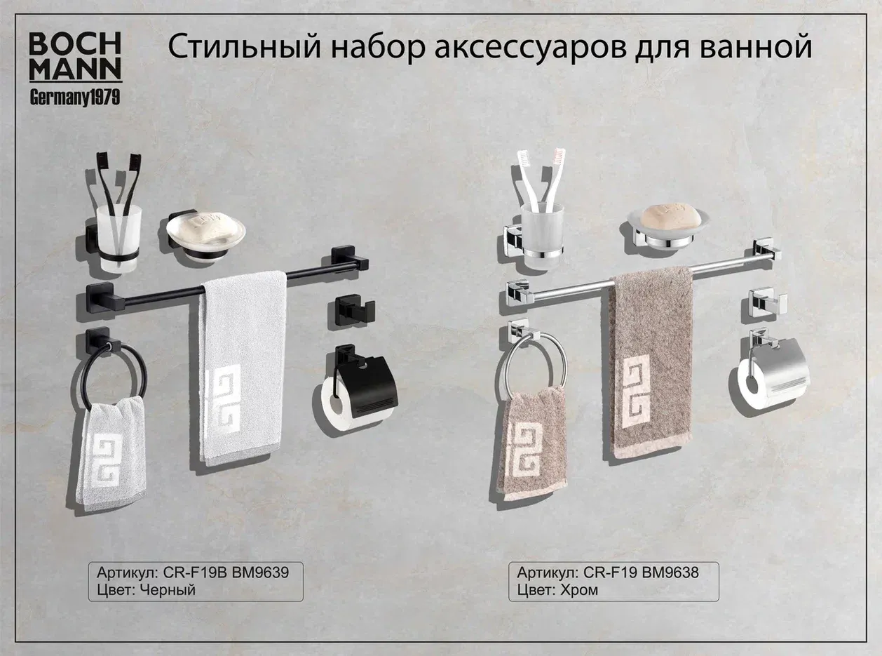 Ванная комната является одним из любимых и часто посещаемых мест человека. Мы проводим там больше 14 тысяч часов за всю жизнь, поэтому она обязательно должна быть не только уютной, но и эргономичной. Ни одна ванная комната не может обойтись без аксессуаров - незаметных на первый взгляд, но совершенно необходимых вещей, которые делают жизнь нашу намного комфортней. Они не только практичны, но и создают общую атмосферу ванной комнаты, придают ей индивидуальность и шарм.Дизайнерские аксессуары BOCH MANN стилистически завершают образ ванной комнаты, создавая целостную и продуманную концепцию. Их функциональный дизайн позволяет дополнить практически любой интерьер, а широкий ассортимент предоставляет свободу выбора. Так как срок службы аксессуаров для ванных и туалетных комнат напрямую зависит от материала, из которого они изготовлены, в производстве аксессуаров BOCH MANN используются только материалы самого высокого качества – нержавеющая сталь и закалённое стекло. Изделия из нержавеющей стали — рекордсмены по сроку службы, сохранению отличного внешнего вида и высоких эксплуатационных характеристик. Надежность конструкций аксессуаров BOCH MANN, профессиональное крепление и прочность покрытия позволяют использовать изделия не только в домашних условиях, но также и в общественных местах, включая отели и рестораны. Безупречность исполнения каждой детали, точность даже в мелочах — это признаки истинной элитарности бренда BOCH MANN.Многие дизайнеры советуют не приобретать аксессуары по отдельности, а отдавать предпочтения уже готовым наборам. Все потому, что при отдельной покупке вы потратите больше денег и можете купить не подходящие друг к другу по дизайну и внешним характеристикам предметы. Выбирая уже готовый набор, вы способны выдержать единую стилистику вашей ванной комнаты. Набор аксессуаров для ванной является не только практичным решением, но и прекрасным элементом декора, с которым ваша ванная комната станет местом, где вы сможете расслабиться, насладиться уютом и эстетикой. Наборы аксессуаров Bochmann для ванной не только помогут сделать вашу ванную максимально комфортной и функциональной, но и станут элегантным дополнением к интерьеру.Преимущества:- эстетический внешний вид;- высококачественные материалы – нержавеющая сталь и закаленное стекло;- тип крепления – скрытый, отличающийся повышенной надёжностью;- два варианта цветов – классический черный и универсальный хром;- чёткие формы каждой детали;- качество, проверенное годами.Состав набора: