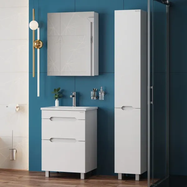 Пенал имеет два отделения за распашными дверцами с доводчиками, полки внутри регулируются по высоте. Ручки, изящно интегрированные в фасады, позволяют сделать эксплуатацию мебели более удобной и практичной.