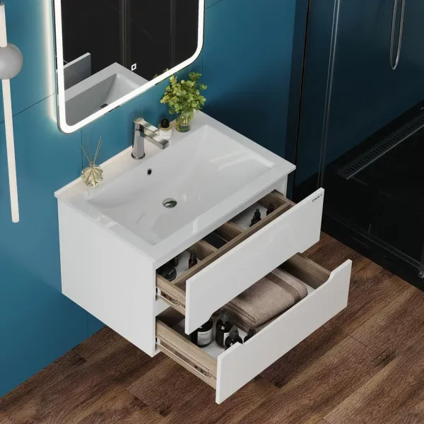 Тумба имеет два ящика с направляющими полного выдвижения: нижний предназначен для больших предметов, а верхний, имеющий удобную систему организации пространства, - для мелких аксессуаров. Ручки, изящно интегрированные в фасады, позволяют сделать эксплуатацию мебели более удобной и практичной.