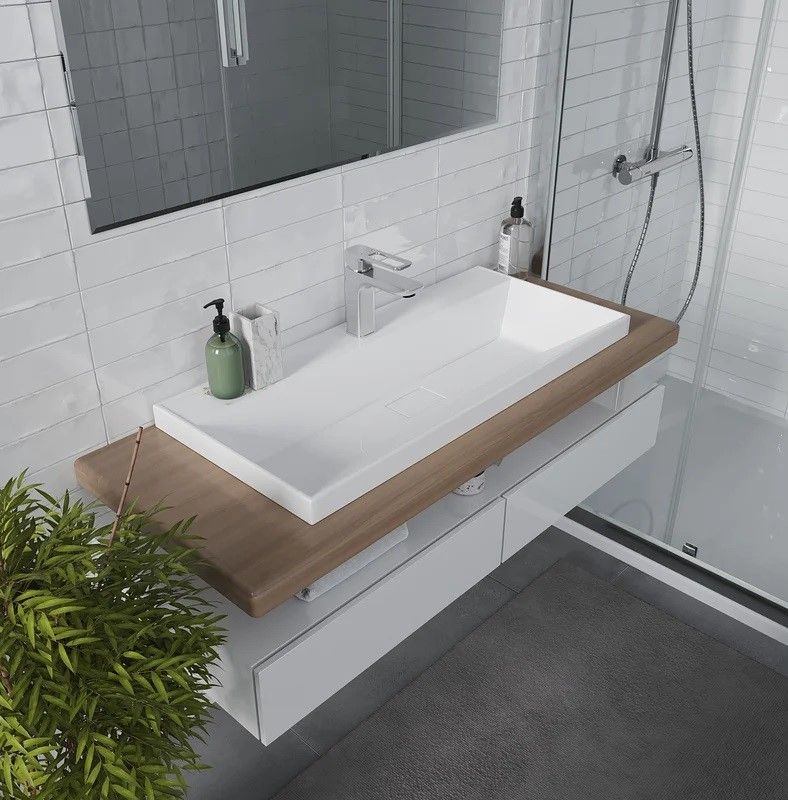 Раковина встраивается на мебель, в столешницу и на подстолье. Верхний слой представляет собой декоративно-защитное покрытие - импортный сантехнический гелькоут. Донный клапан отсутствует. В комплектацию входит декоративная накладка на слив.