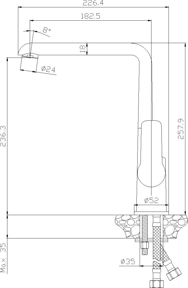 Смеситель для раковины Rossinka W35-23 монолитный. Пластиковый аэратор с изменяемым углом подачи воды, керамический картридж 35 мм, гибкая подводка 35 см - 2 шт, присоединительная группа для горизонтального крепления, металлическая рукоятка