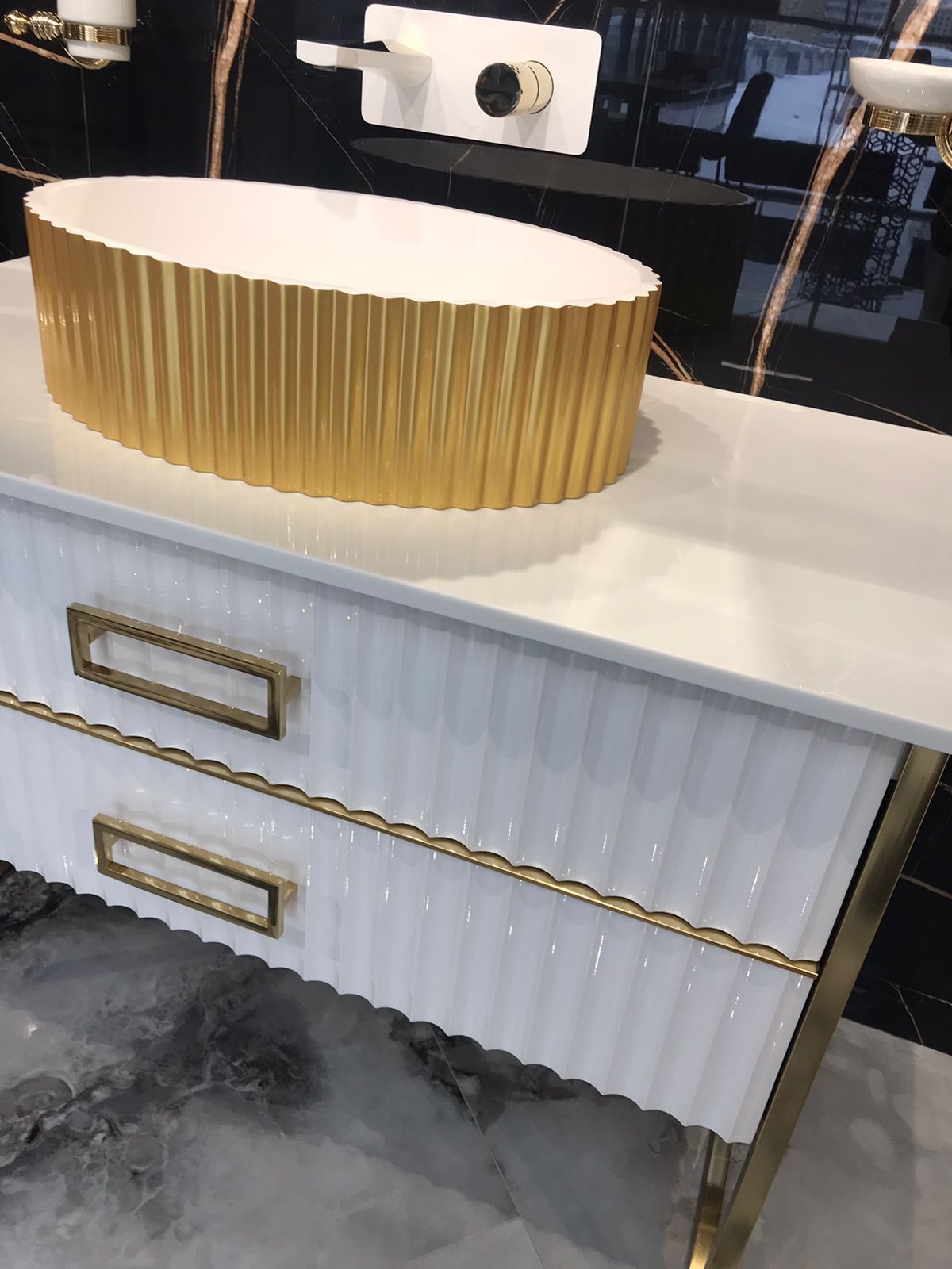 Столешница изготовлена из инновационного материала Solid Glass, в состав которого входит мраморная крошка и стекло. Материал черезвычайно прочен, не оставляет следов царапин и обладает неповторимой глубиной белого цвета.