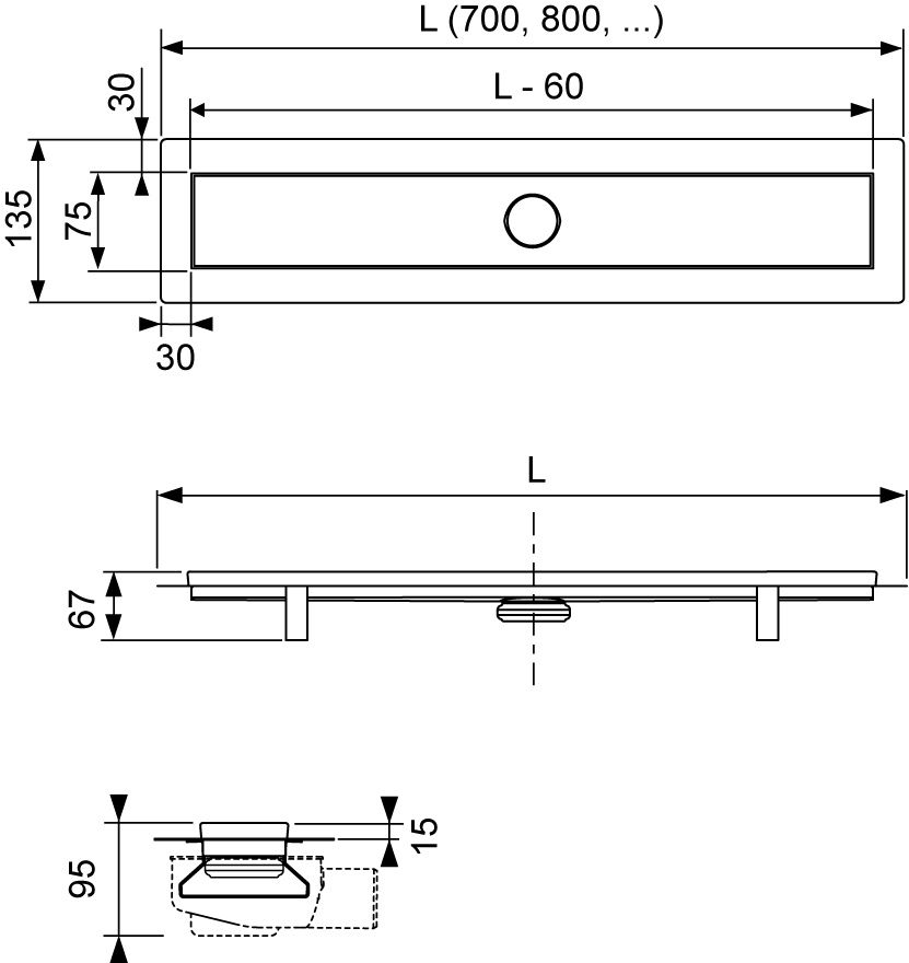 Комплект поставки: • дренажный канал из нержавеющей стали; • cифон DN 50, выход вбок, производительность (согласно DIN EN 1253) при уровне воды 10/20 мм над решеткой: 0,7/0,8 л/с; уровень гидрозатвора = 25 мм согласно DIN EN 1253; • гидроизоляционная манжета; • погружной стакан с мембраной; • 4 опоры, высота до 125 мм (до уровня чистового пола); • декоративная решетка “straight” Внимание! Минимальная высота монтажа 95 мм (от чернового пола до уровня чистового покрытия)