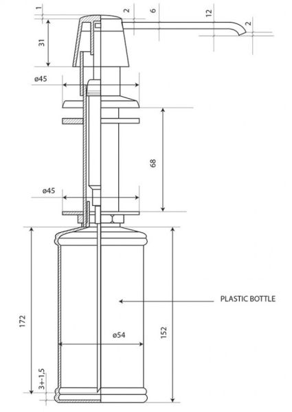 Дозатор для жидкого мыла или иного моющего средства PAINI. Дозатор встраиваемый для использования в ванной или на кухне. Объем ёмкости для мыла или моющего средства 0,5 л.