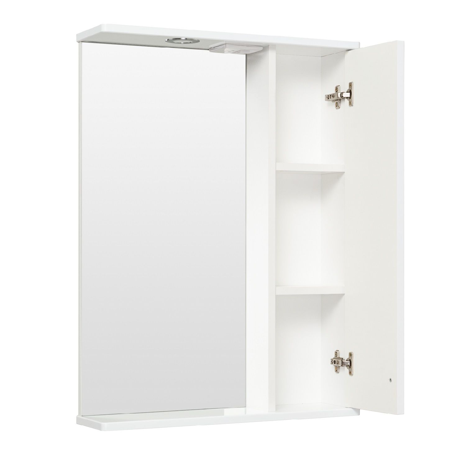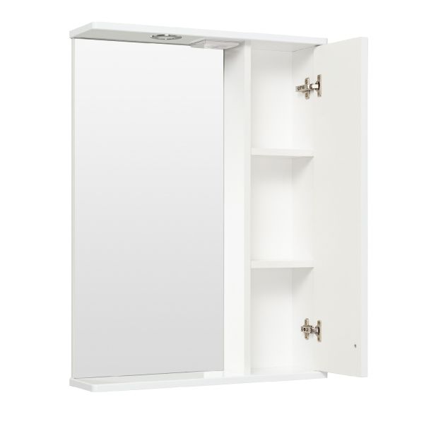 Зеркальный шкаф оборудован одним врезным светодиодным светильником 220В и розеткой с выключателем. Справа - шкафчик с распашным фасадом и двумя внутренними полками. Петли со встроенным доводчиком, ручка - 1шт. Выпускается только в правом исполнении.