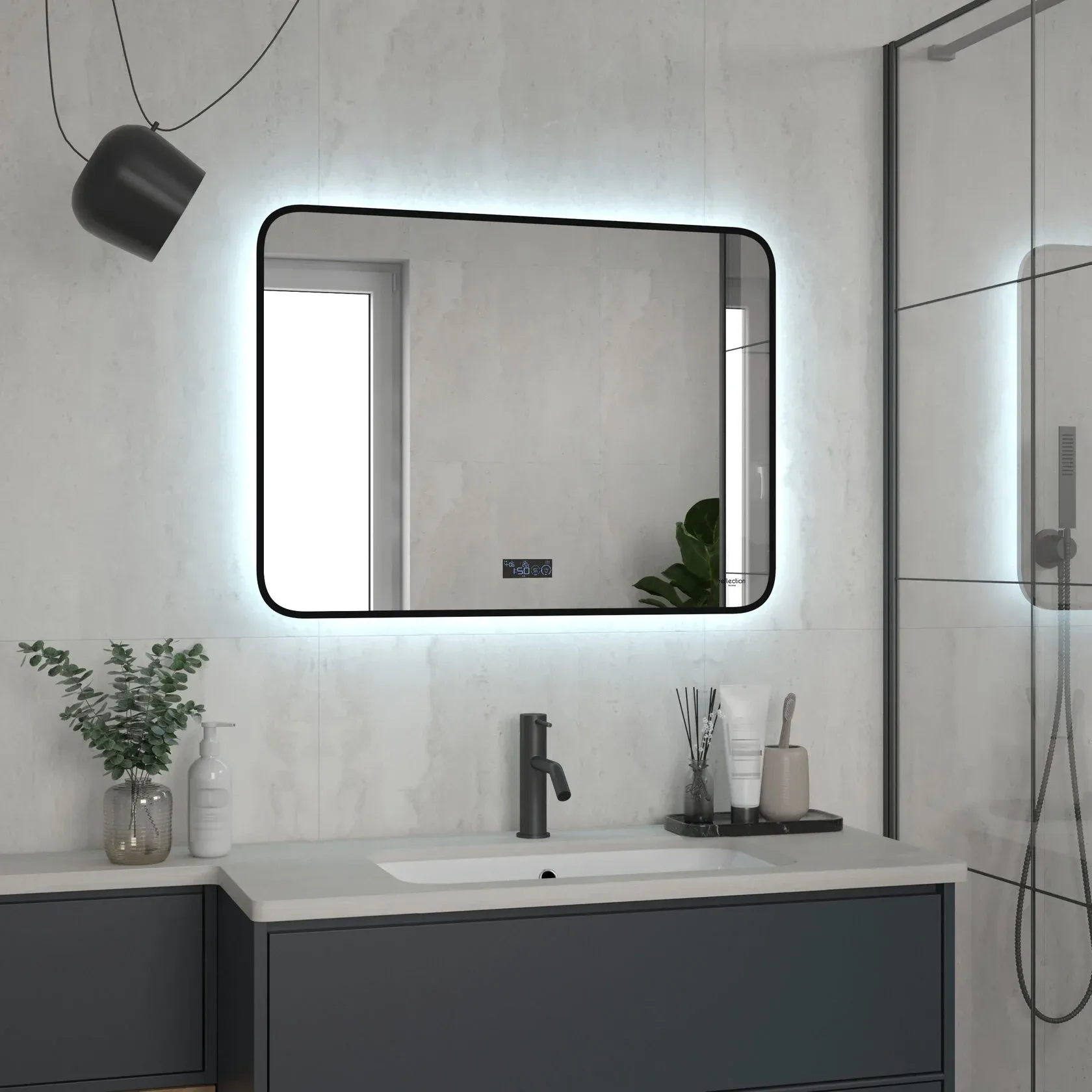 Reflexion Shadow - сочетание красоты и функциональности. Стильный современный дизайн зеркала дополнен часами и термометром. Система подогрева полотна предотвращает запотевание зеркала. Скругленные грани придают утонченный дизайн и безопасны для ваших детей. Зеркало Reflexion Shadow прекрасно дополнит интерьер как ванной комнаты, так и прихожей, спальни или гостиной.